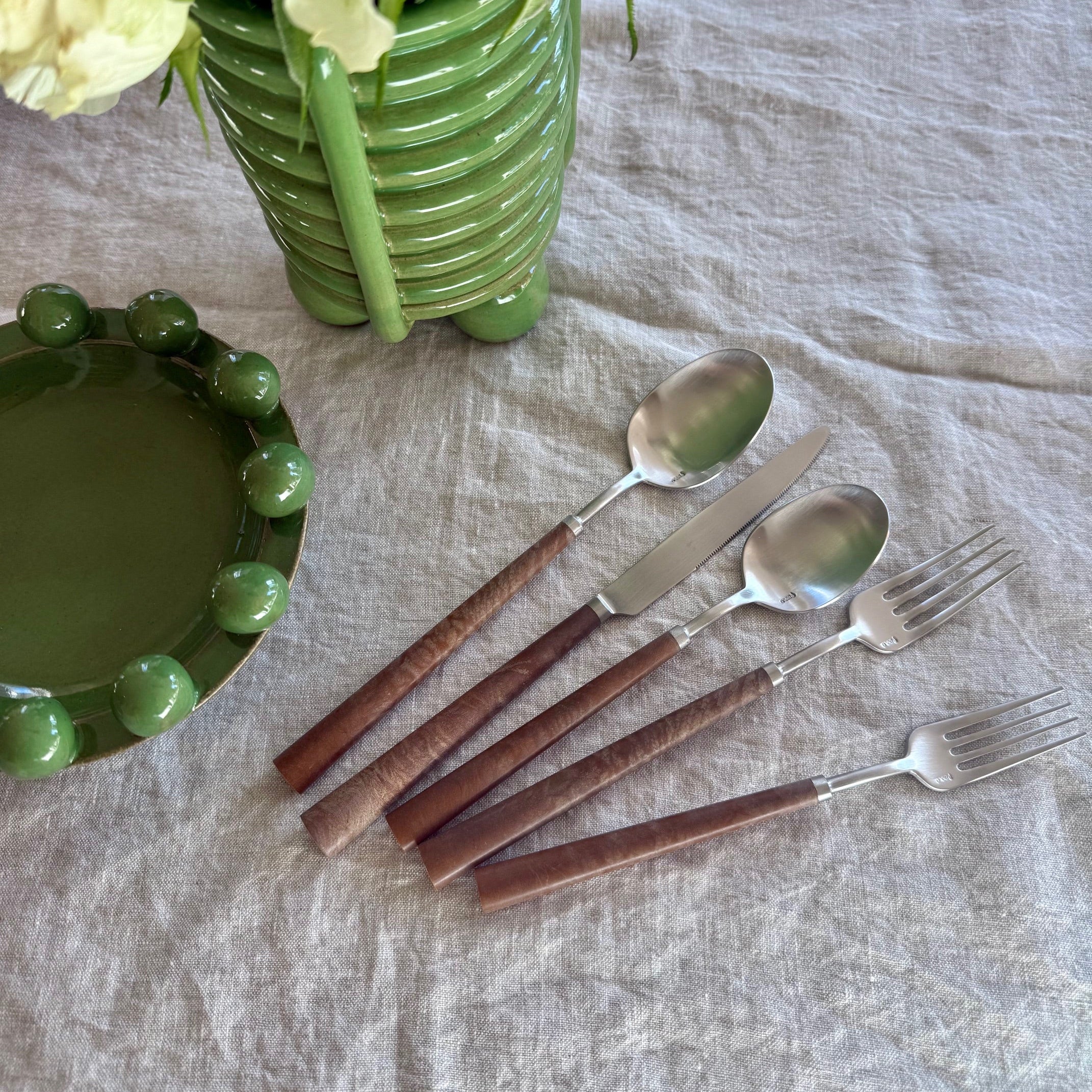 Crafted with stainless steel and tapered resin handles reminiscent of burled wood, this simple yet versatile line up adds an understated, elevated element to your table. 20-piece set includes four of each: salad fork, dinner fork, knife, dinner spoon, teaspoon.