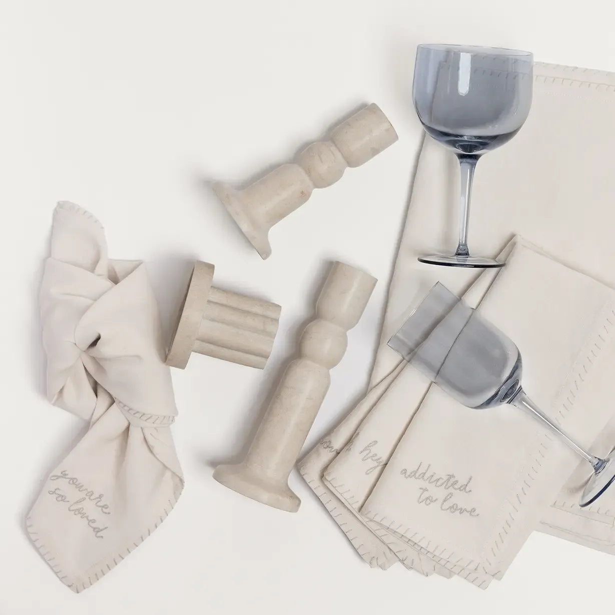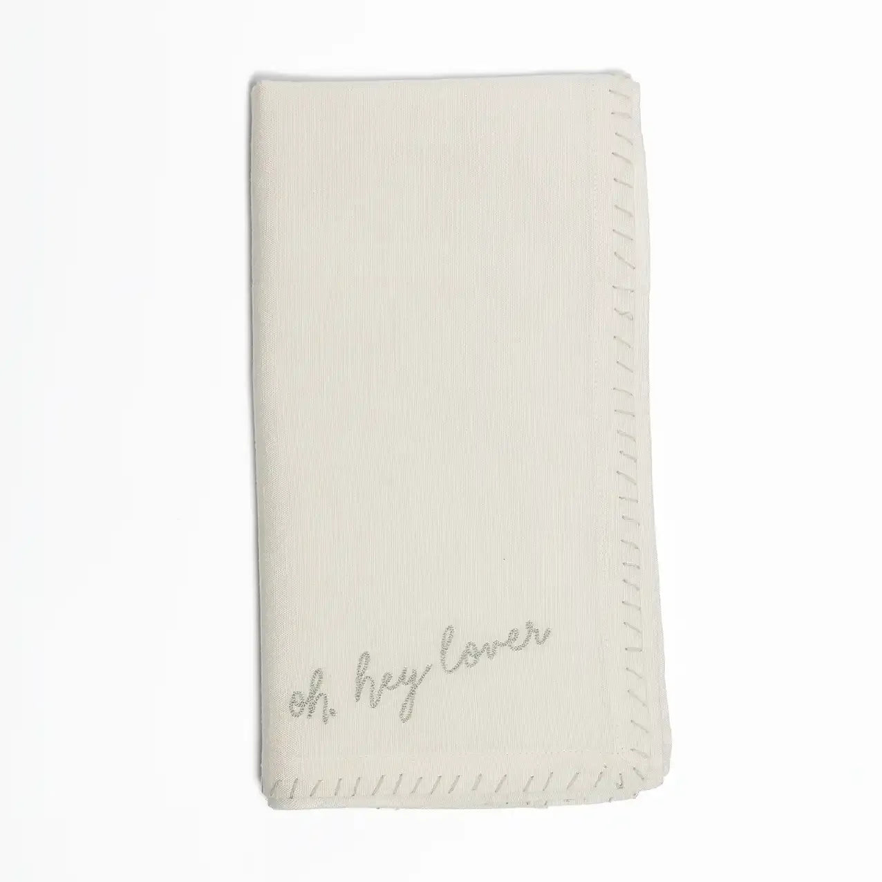 The host who opens their home, opens their heart. Each cotton-linen napkin reflects that sentiment with a sweet hand-embroidered love note in Purvi’s original handwriting. Finished with a matching gray whipstitch border. Set of four.
