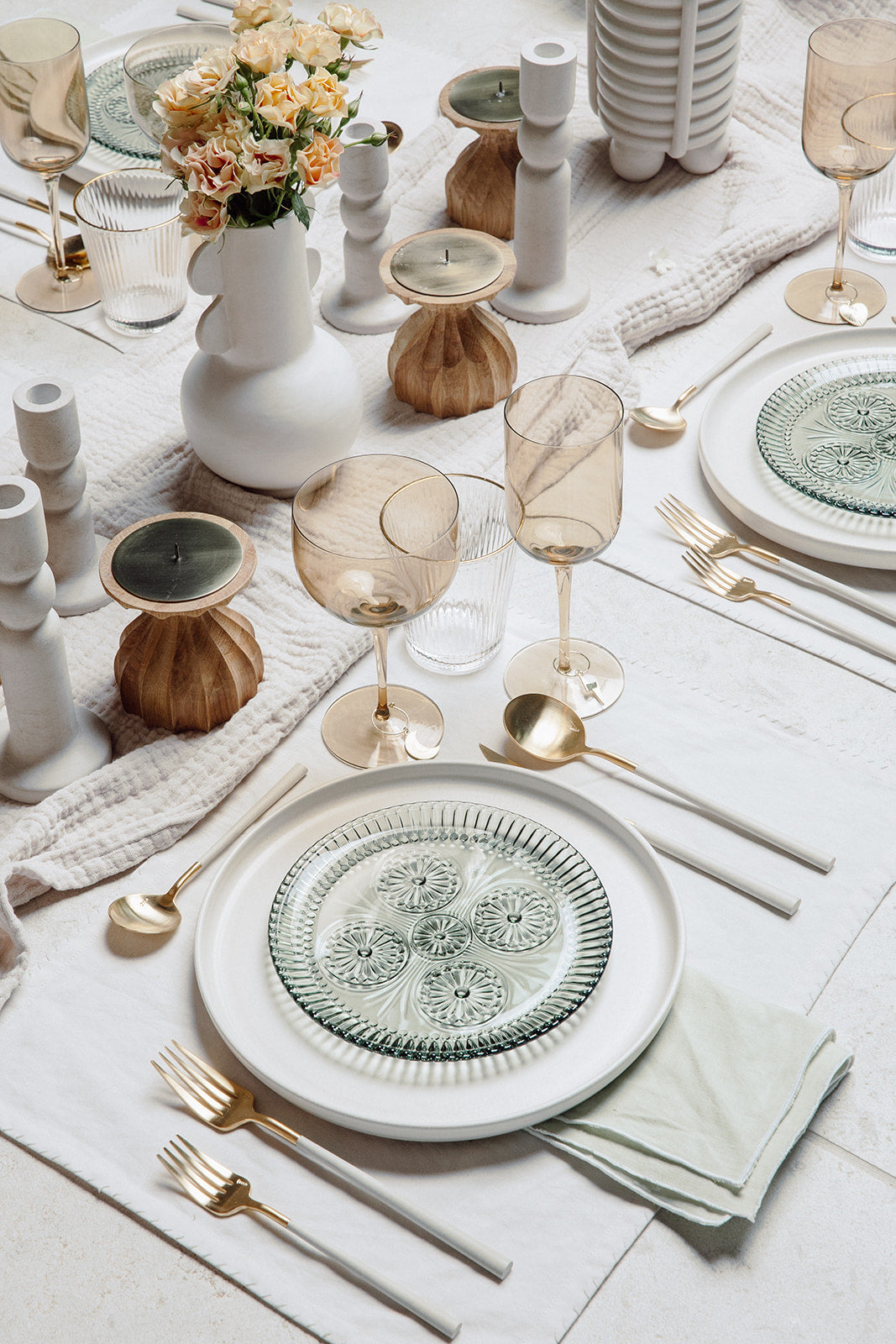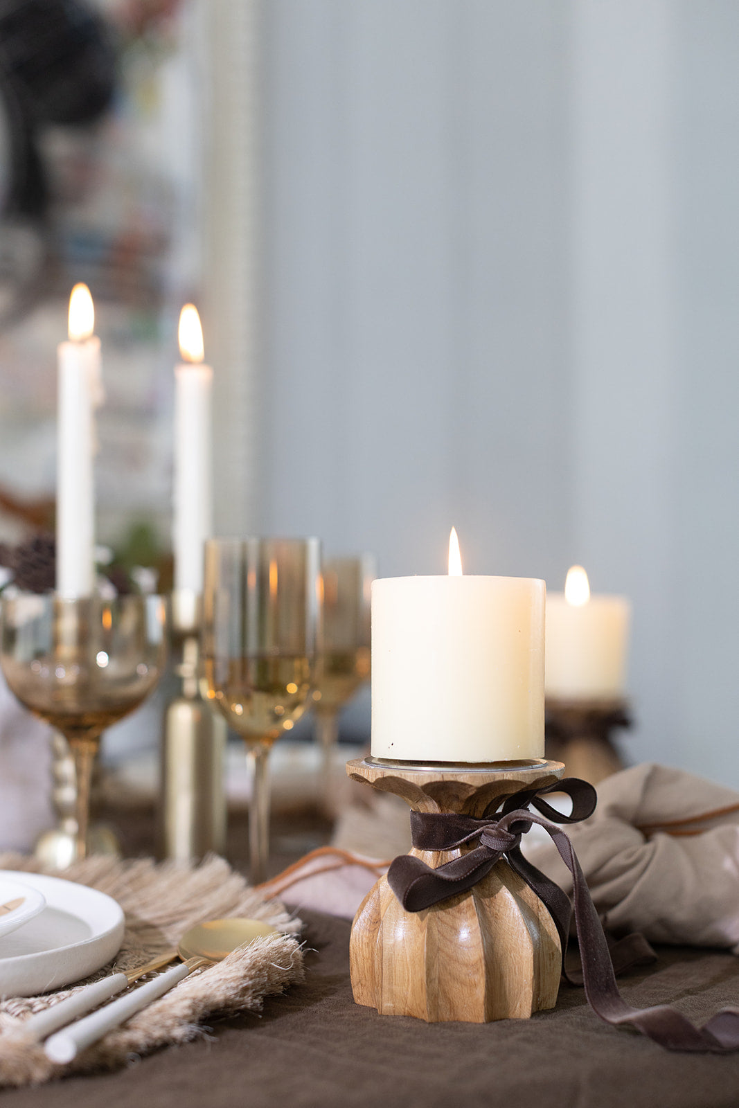 The petite fluted oak wood pillar candle holder is wrapped in a natural finish and adorned with a thin antique brass metal plate. Small in stature, big in warmth.